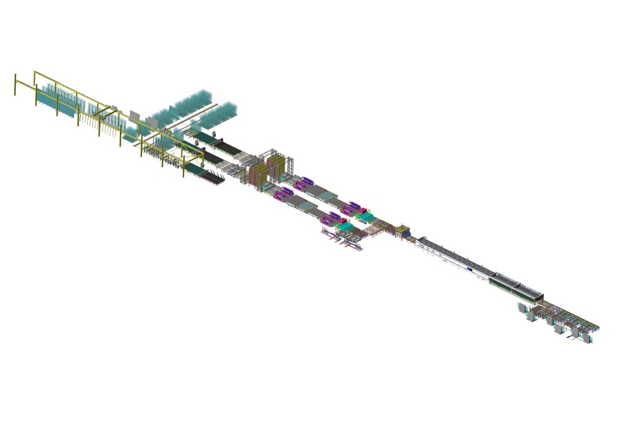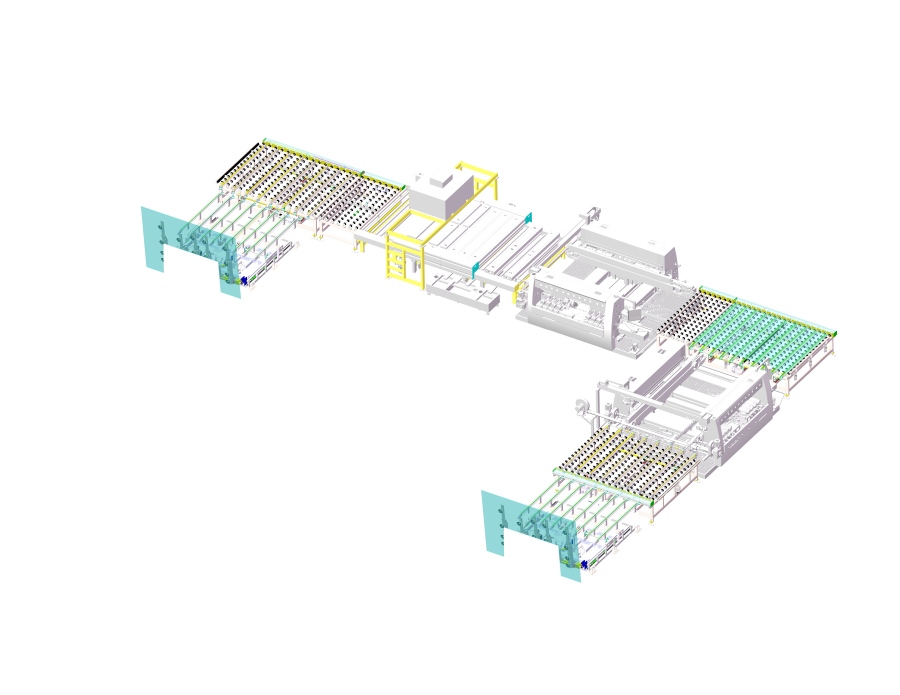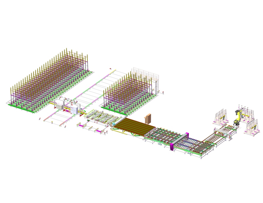 Glass storage shuttle system working with storage gantry system--Cutting machine-- Laser marking machine--Horizontal sorting system--Double edger--Washing machine- Horizontal sorting table--Tempering furnace--Furnace unloading